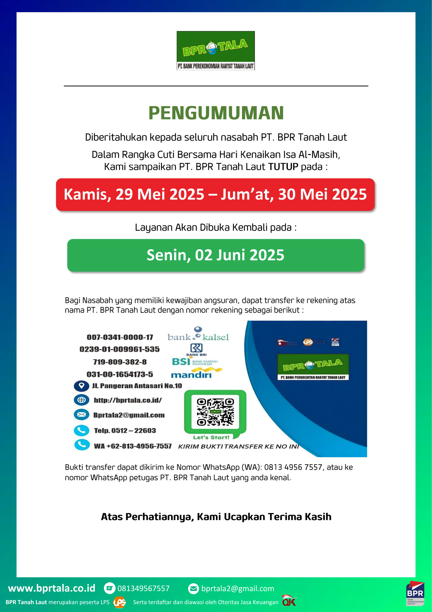 Sehubungan dengan peringatan Hari Kenaikan Isa Al-Masih, maka dengan ini kami informasikan bahwa: